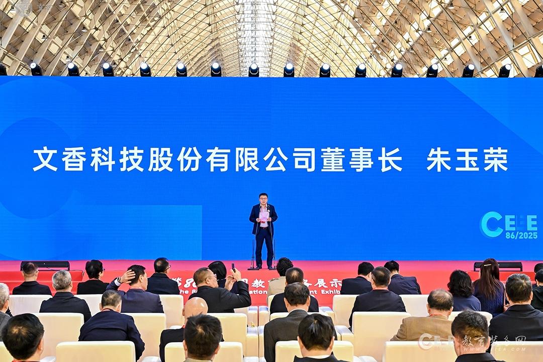 作为本届展会独家冠名商,文香董事长朱玉荣在开幕式上发表致辞。朱总表示:"文香始终致力于推动人工智能技术与教育场景的深度融合以创新驱动教育变革。本次展会,我们带来了覆盖教学全场景的AI解决方案,希望通过科技赋能助力中国教育数字化转型升级。”