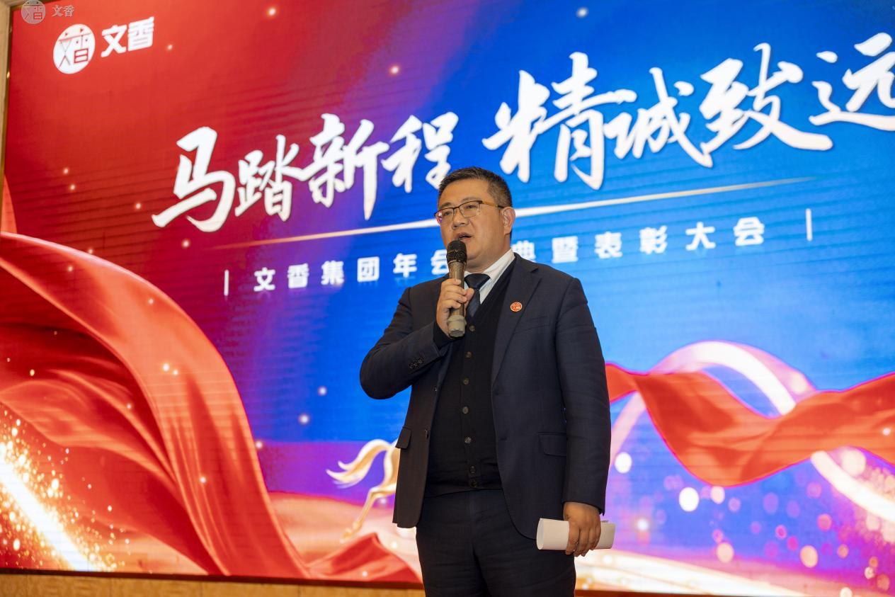 颁奖礼后,文香董事长朱玉荣为大会作闭幕总结发言。在半小时的讲话中,他感谢了全体员工过去一年的辛勤付出,并指出2026年是文香战略落地的关键一年。他鼓励大家以归零的心态再出发,以此次大会为起点,统一思想、坚定信心,共同开创更加辉煌的未来。