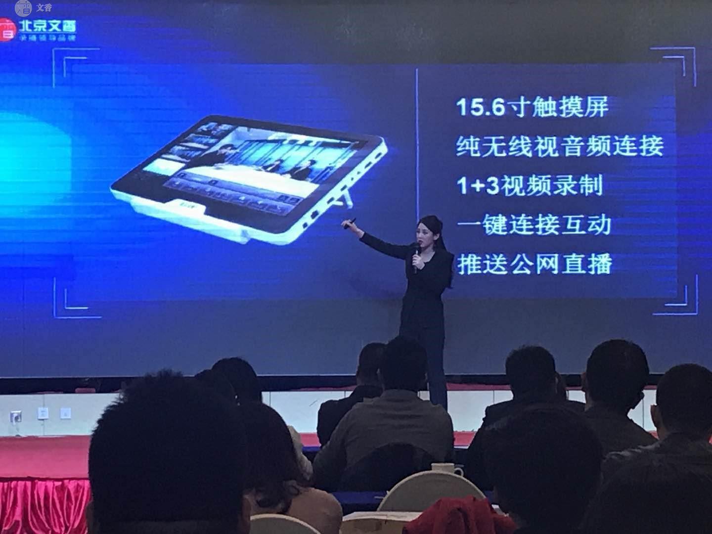 随着赵总致辞结束,会议开始正式产品讲解阶段。培训部经理王莹对文香2018“拳头力作”PAD录播、双屏录播产品特点进行了详细的讲解,在场嘉宾均对两款超高性能、超薄机身、超强性价比的便携产品表现出浓厚的兴趣! 接下来,她还对文香合作伙伴——迪乐姆创客产品及和盛前沿工业机器人教育实训系统进行了详细讲解。